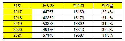 많은 분들이 선호하시는 자격증인만큼 응시인원도 다른 자격증에 비해 월등히 많습니다. 하지만 합격률은 32.7%로 쉽지 않은 자격증에 속합니다.