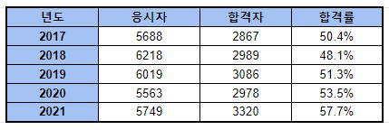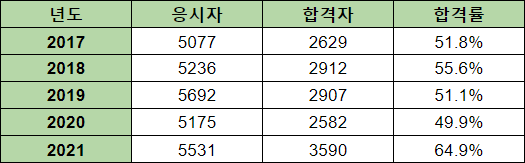 5년간의 필기 합격률은 평균 48.3%로 비교적 무난한 난이도를 가지고 있습니다.