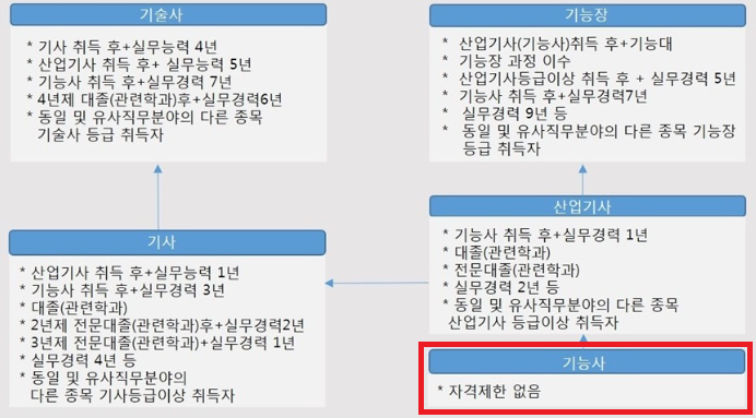 기능사 자격증은 응시에 필요한 조건이 없기 때문에 누구든 남녀노소 도전할 수 있습니다. 또한 토익이나 여타 다른 자격증과 달리 만료기간이 없습니다. 그러므로 4개월 정도의 공부로 한번 취득하면 그 자격이 평생 유효합니다.