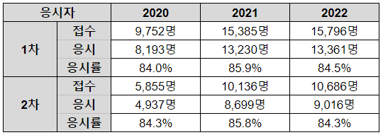 아래는 최신 3년간의 응시현황입니다. 응시에 도전하는 인원이 매해 꾸준히 늘고 있으며 접수 대비 평균 응시률은 84,8%입니다.