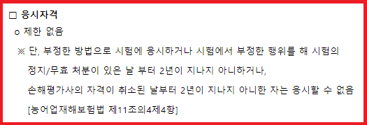 하지만, 농어업재해보험법 제11조의 4제 4항에 의거하여, 손해평가사의 자격이 취소된 날부터 2년이 지나지 않은 자는 응시할 수 없습니다.